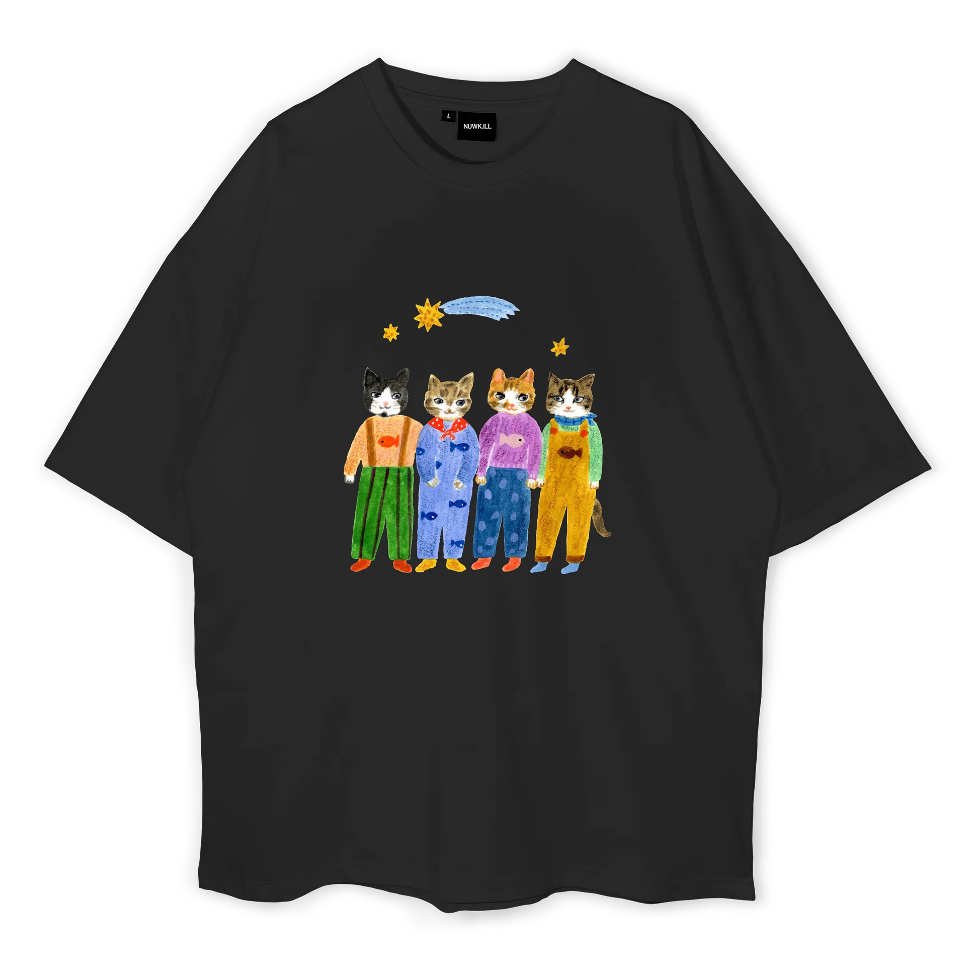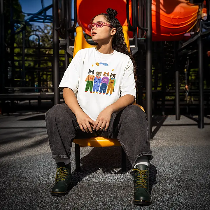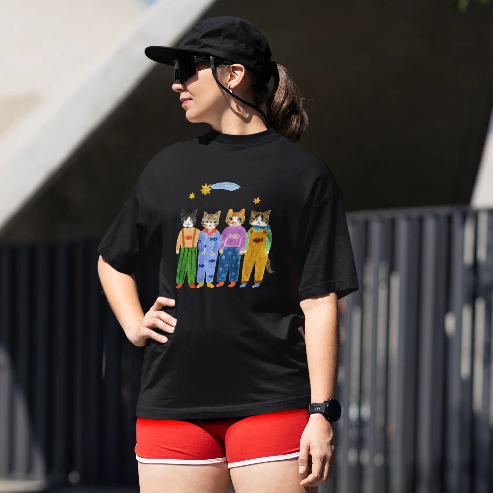 The Cat Crew tee lines up a squad of stylish kitties under a sunny sky—retro colours, wholesome chaos, max cute. Printed on an oversized 100% cotton blank, it’s soft on skin and big on personality—streetwear that still says “aww”.