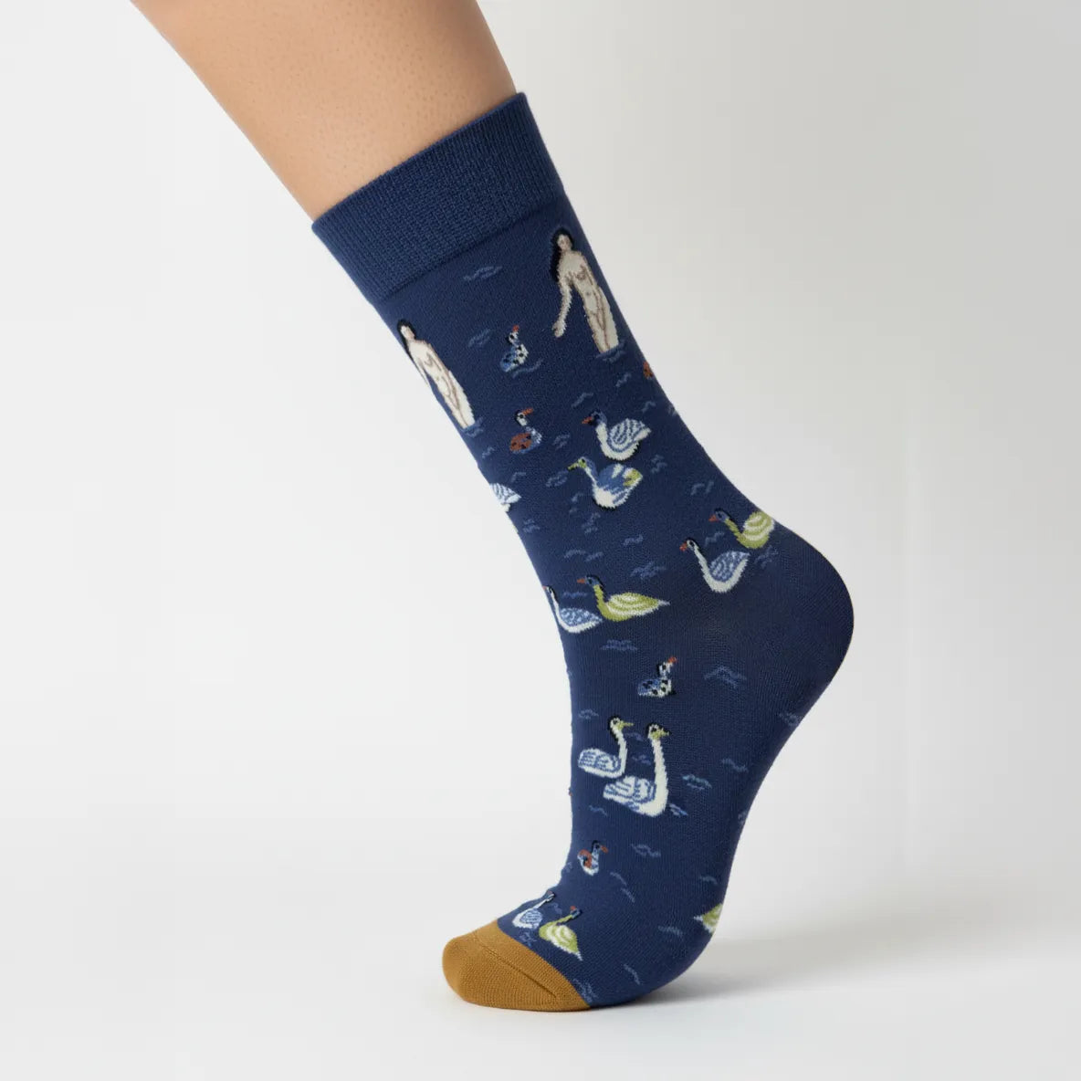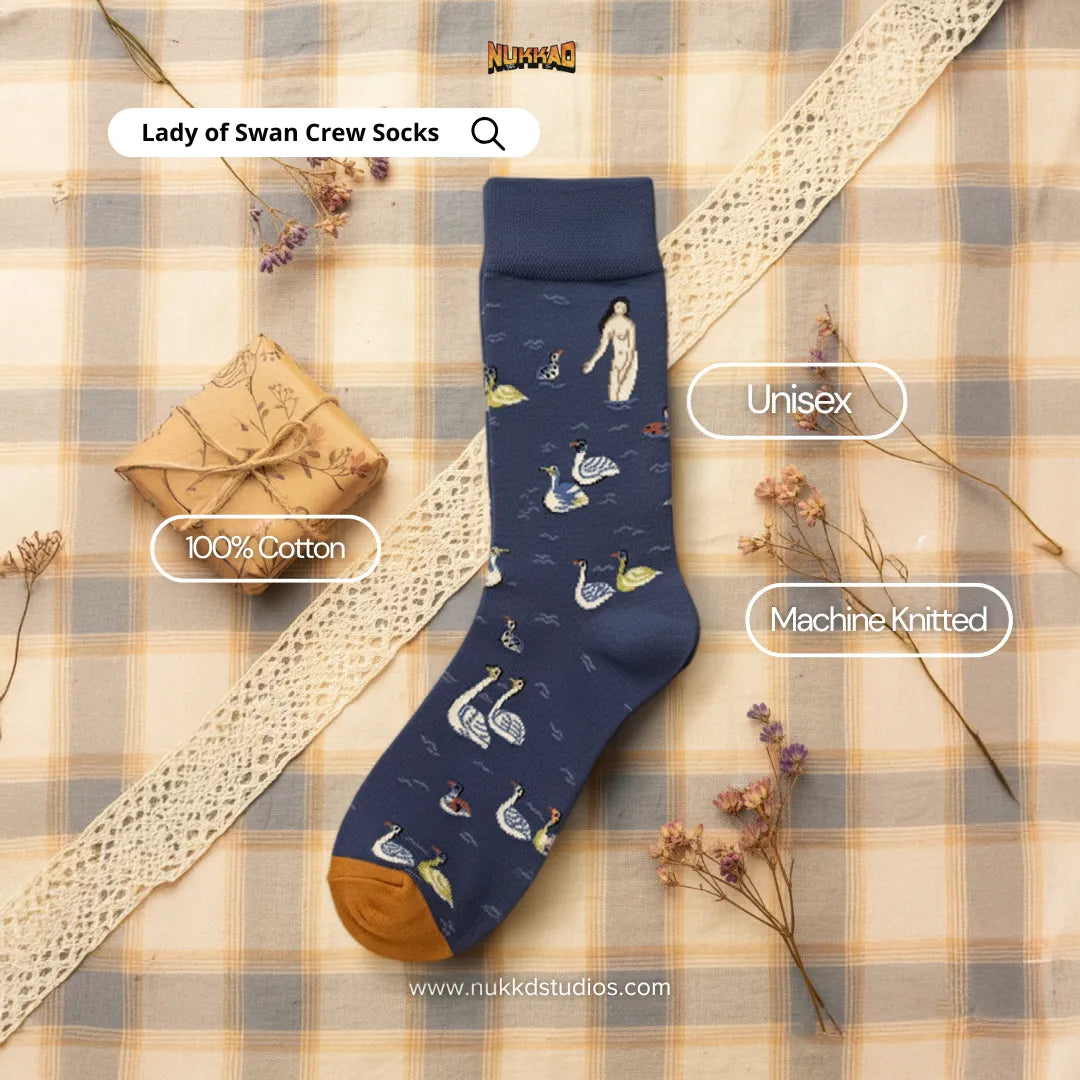Ballet night, every day. Lady of Swan Lake Art Crew sets a moonlit scene of swans gliding across deep navy, with a graceful lady by the shore and a warm ochre toe for contrast. Elegant yet easy, these unisex crew socks bring stage-worthy charm to jeans, skirts, and loafers.