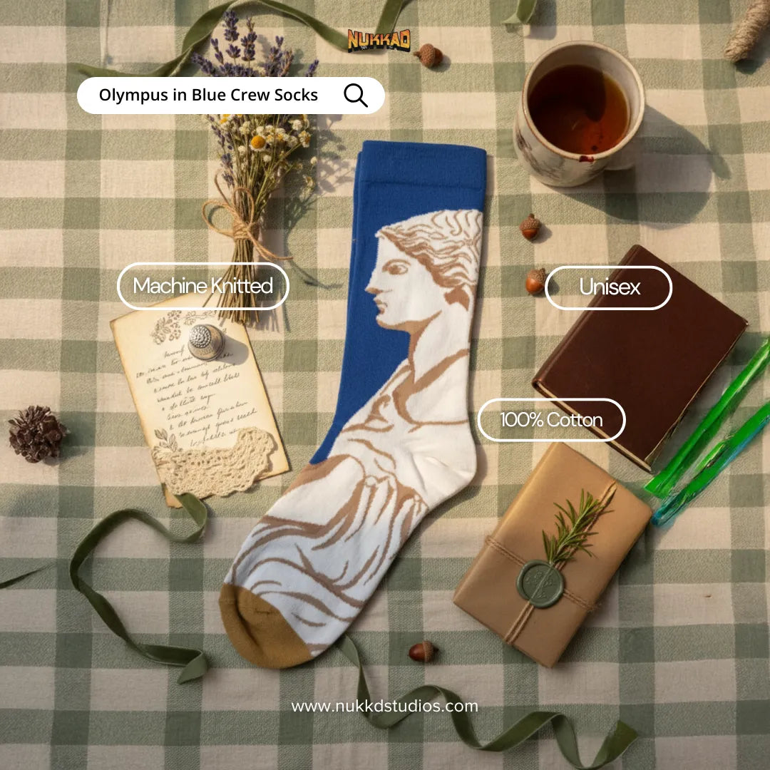 Classics, reimagined. Olympus in Blue Art Socks feature a sculptural Greco-Roman profile in ivory and sand, set against a bold cobalt panel and finished with a warm ochre toe. Minimal, elegant, and endlessly wearable, these unisex crews turn everyday looks into gallery pieces.