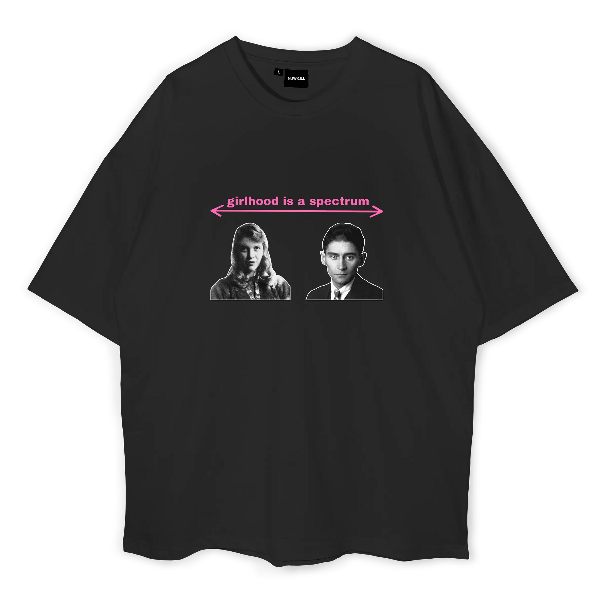 The Plath & Kafka oversized tee pairs two literary icons beneath a hot-pink “girlhood is a spectrum” banner, deadpan portraits, razor wit, museum-poster energy. Printed big on an oversized 100% cotton blank, it’s soft on skin and heavy on Dark Academia vibes. Fan-made literary homage; no affiliation implied.