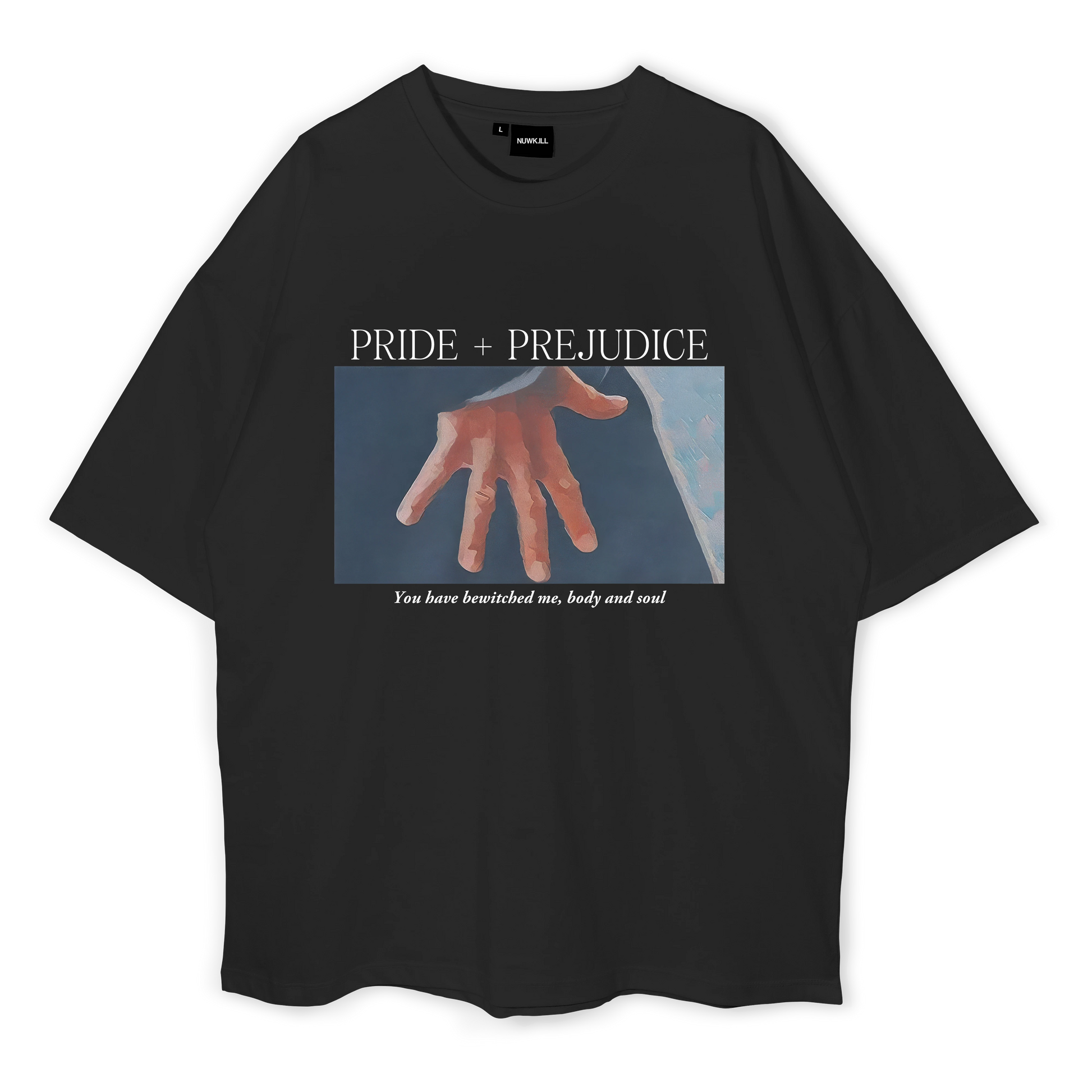 The Pride & Prejudice Oversized T-shirt captures the iconic hand flex from the 2005 film, reimagined in soft painterly strokes. Featuring the text “You have bewitched me, body and soul,” this tee is for every hopeless romantic who fell in love with Darcy (and maybe never recovered). Printed on a 100% cotton oversized black tee that’s as dramatic and soft as your emotional rewatch nights.