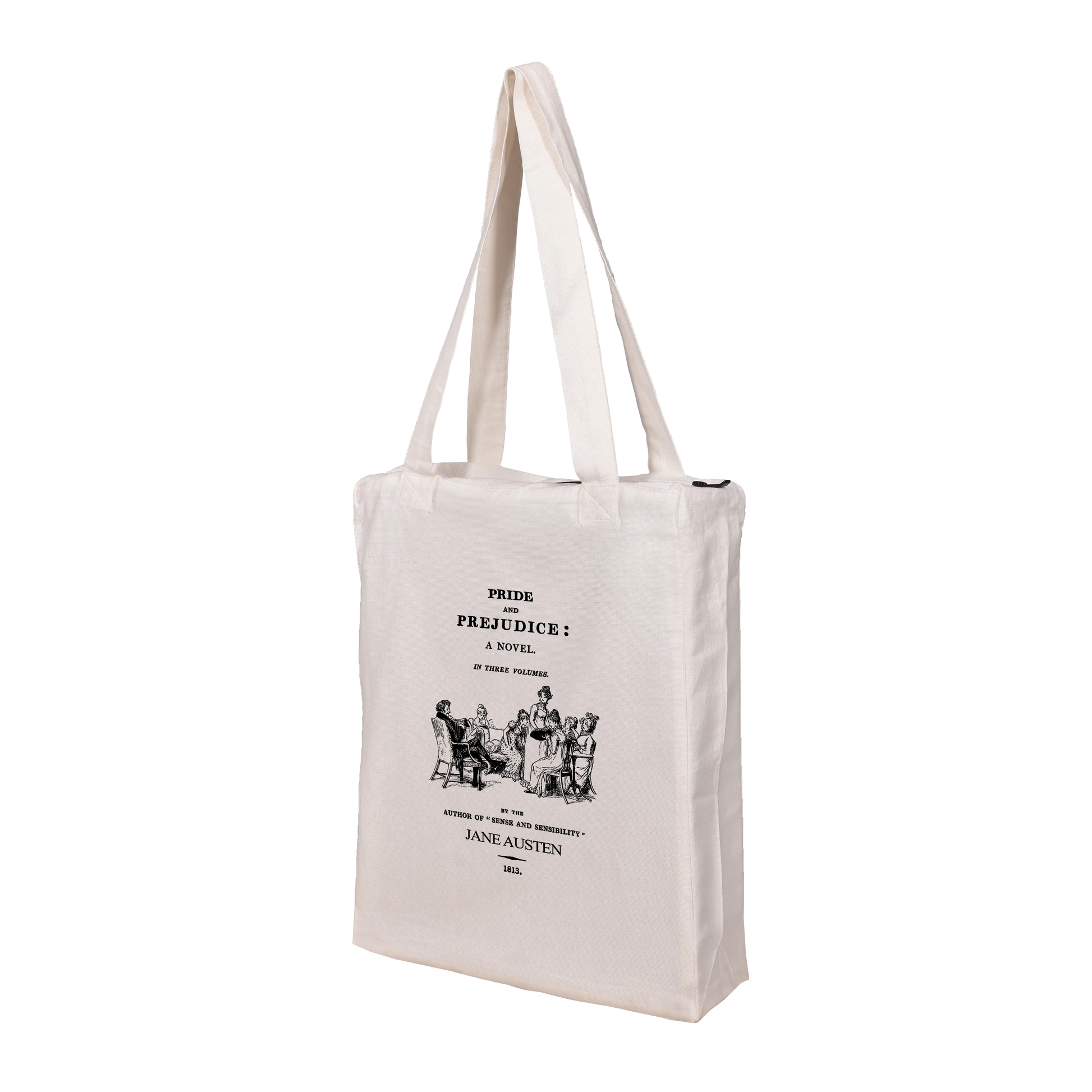 tep into the pages of literary history with our Pride & Prejudice Tote Bag — a timeless tribute to Jane Austen’s most beloved novel. Featuring an authentic vintage-style book cover print from the 1813 first edition, this off-white canvas tote is a must-have for bibliophiles, old souls, and hopeless romantics alike.