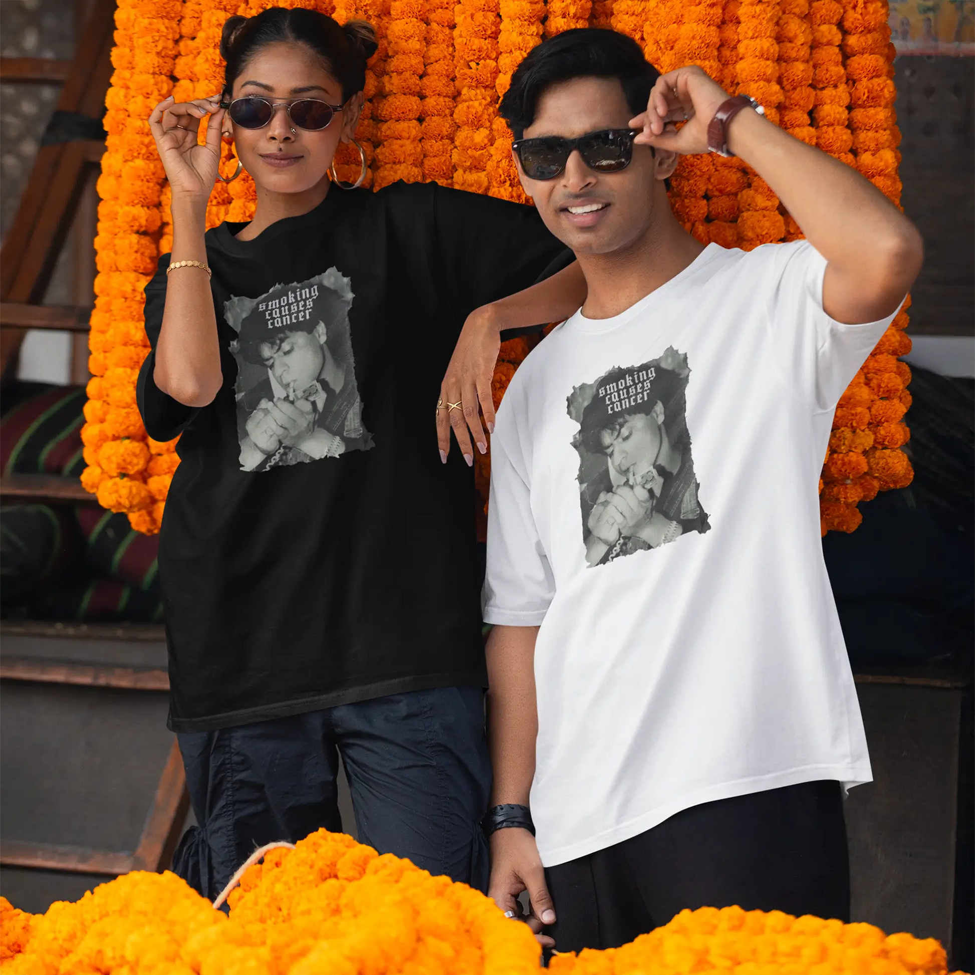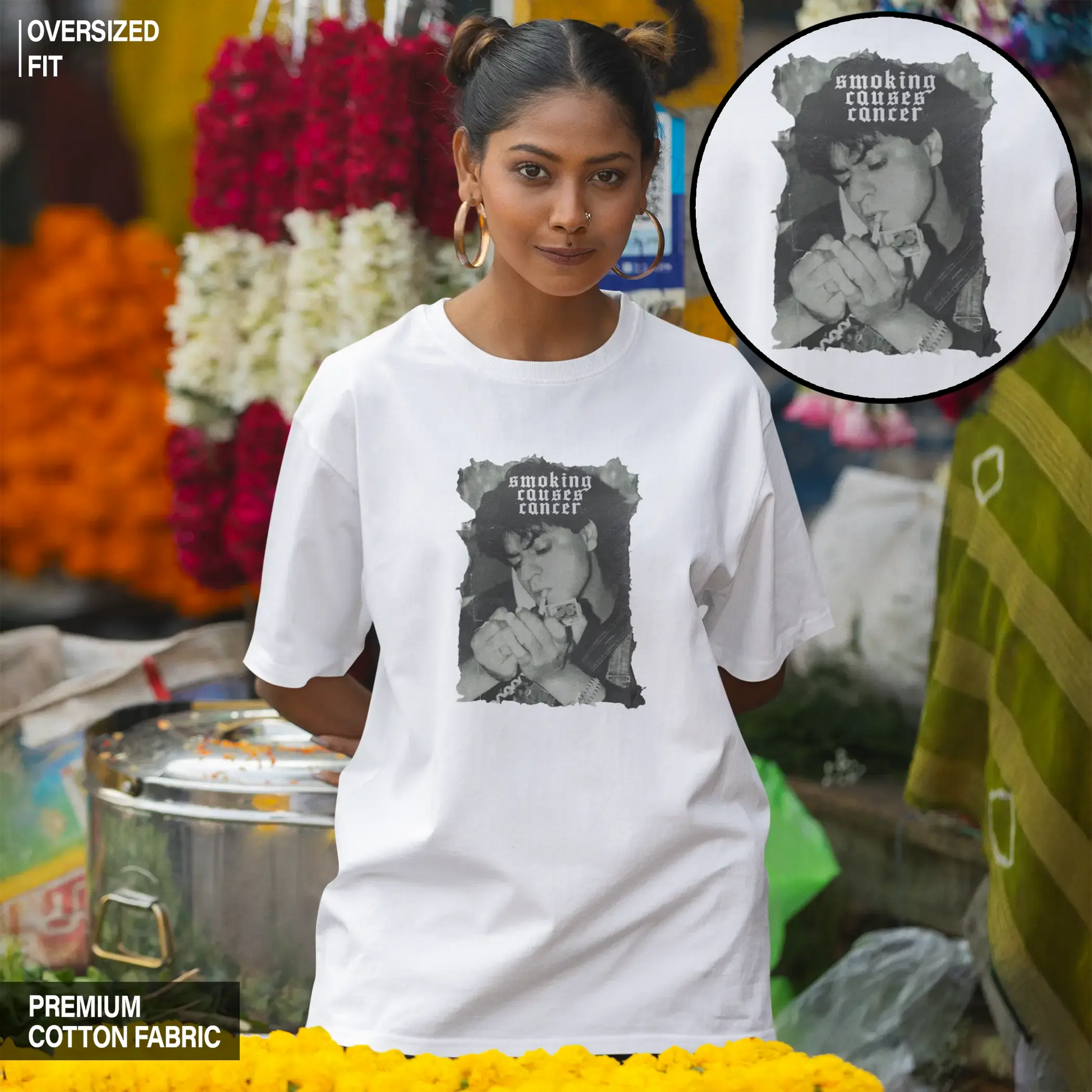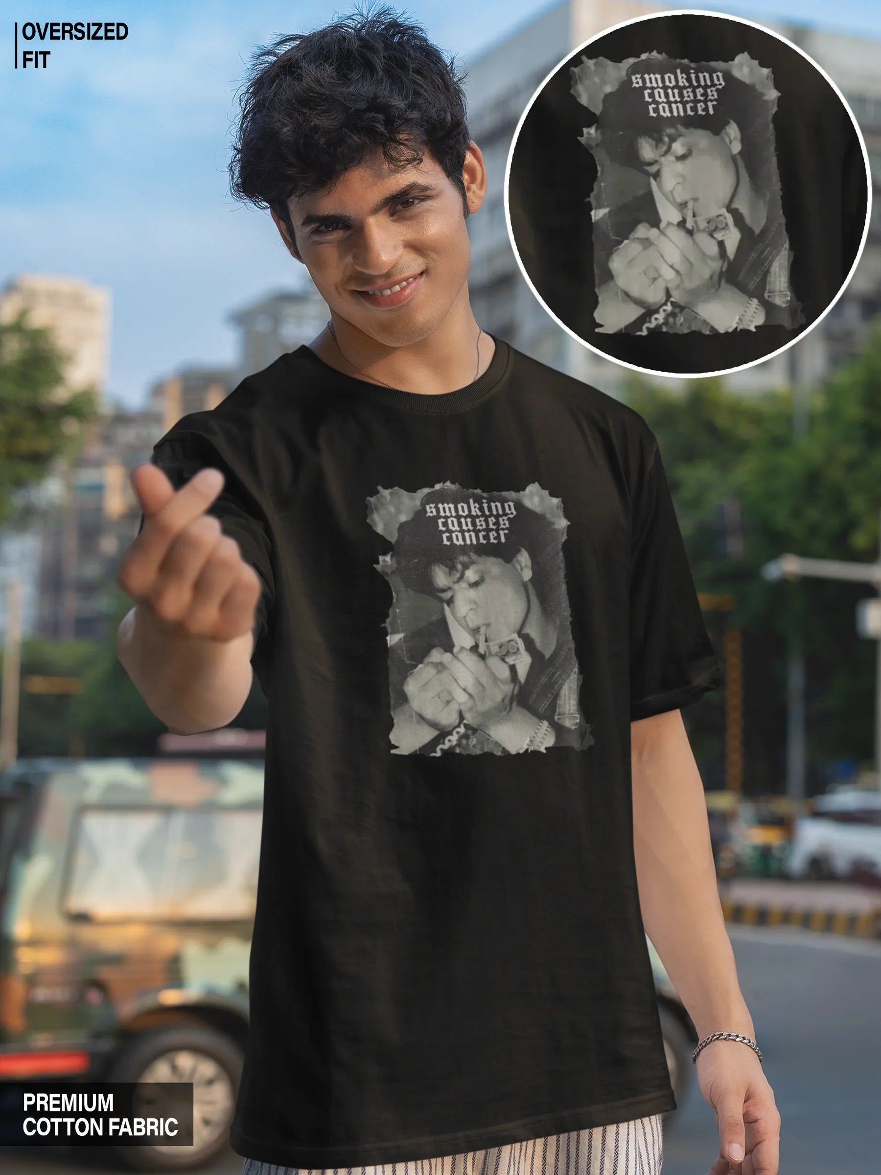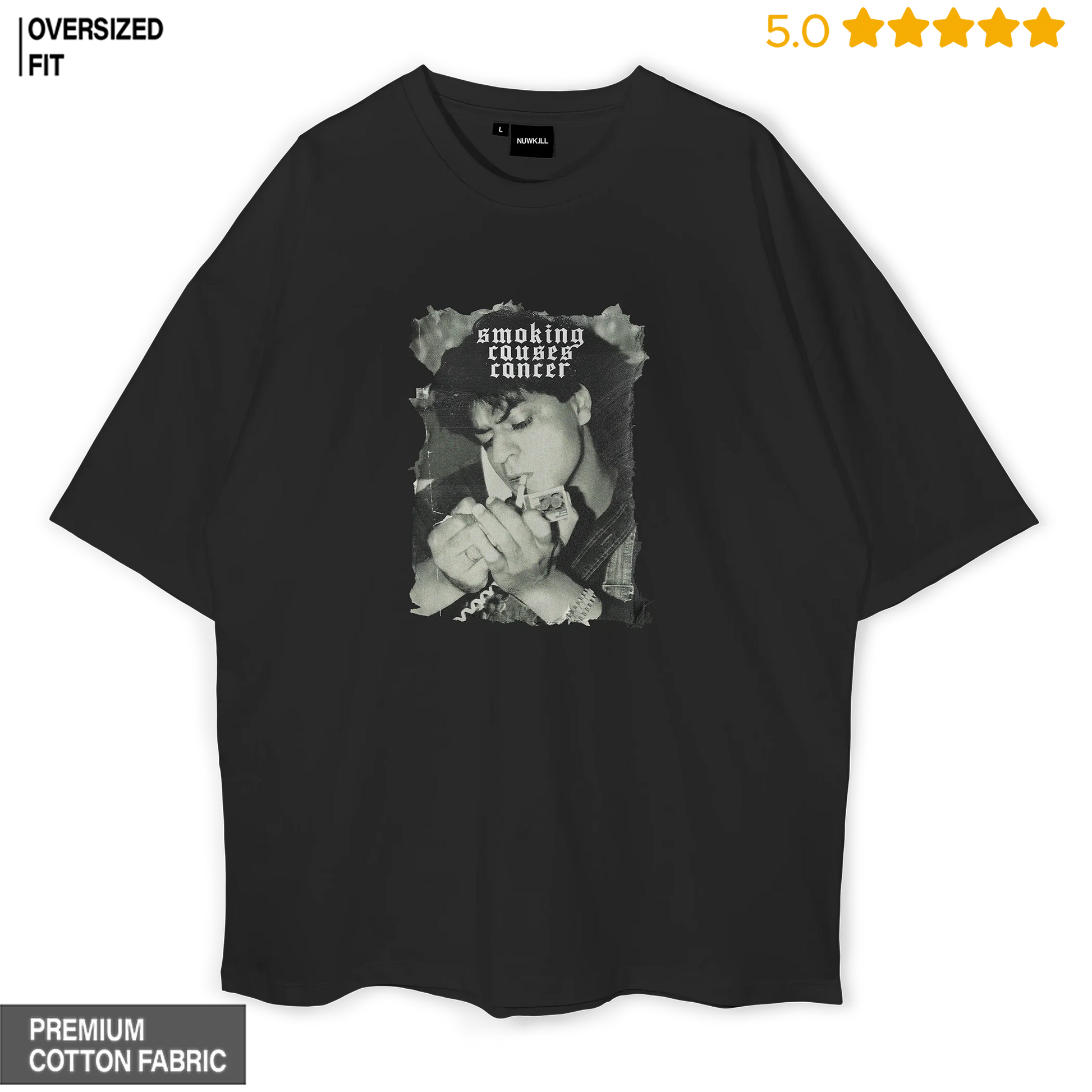 Discover the epitome of Art and style with our Shah Rukh Khan (SRK) - Smoking Causes Cancer Oversized T-shirt. Elevate your wardrobe with this iconic, comfortable, and fashionable T-shirt. It's perfect for those who crave a touch of iconic Bollywood star SRK in their everyday attire. Shop now and stand out in the crowd with this exclusive design.